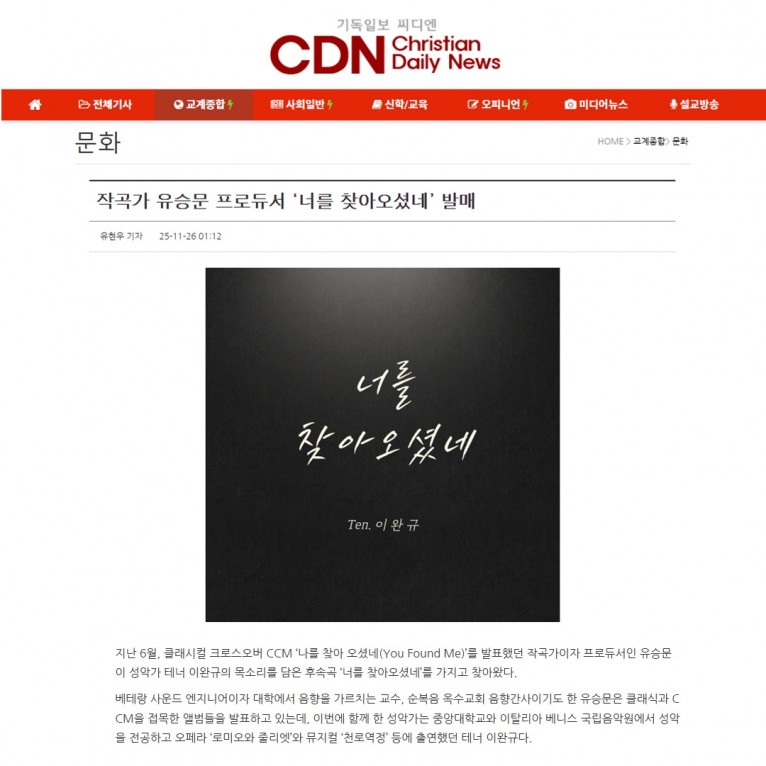 [기사] 작곡가 유승문 프로듀서 ‘너를 찾아오셨네’ 발매(기독일보 씨디엔)